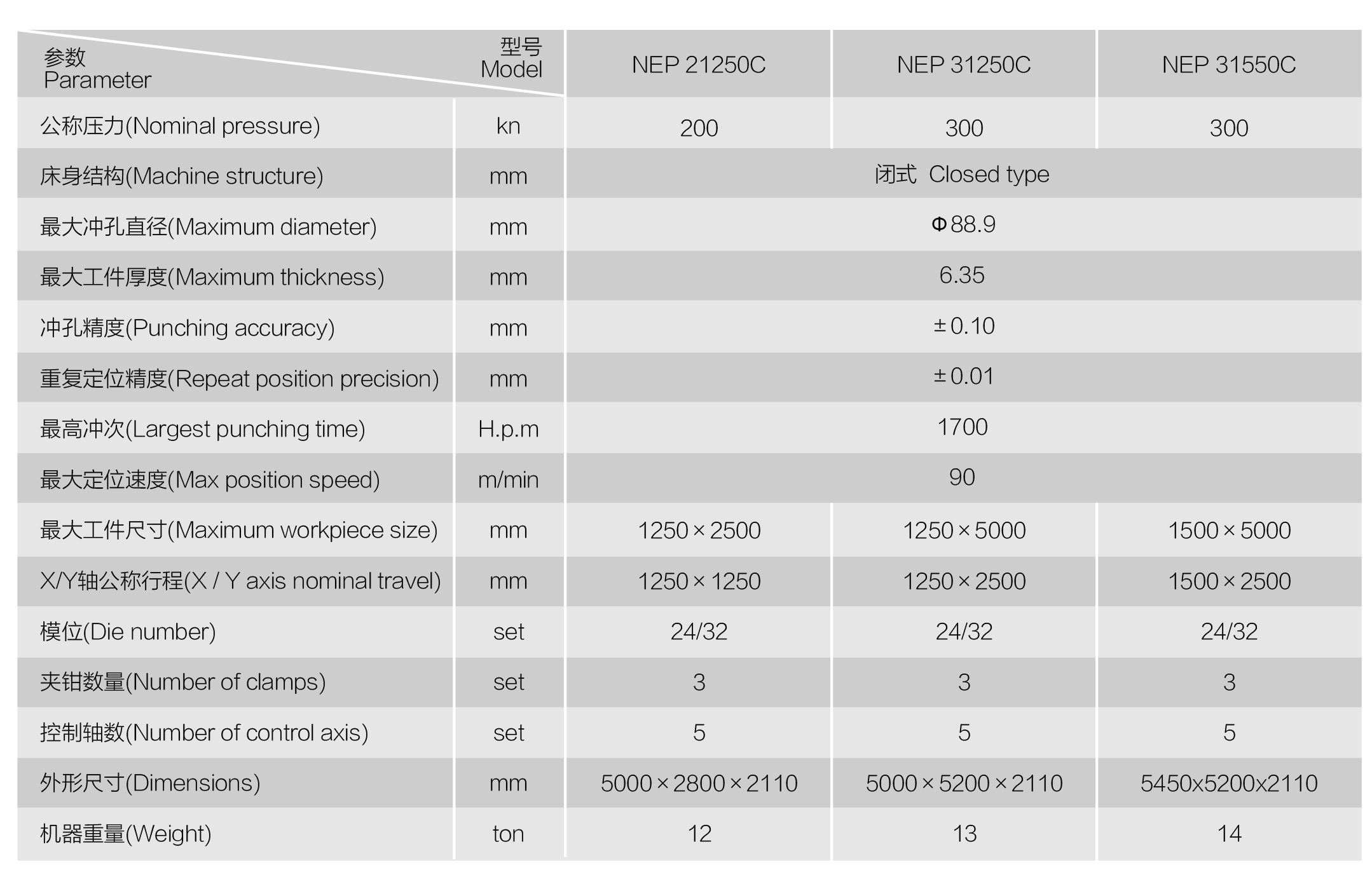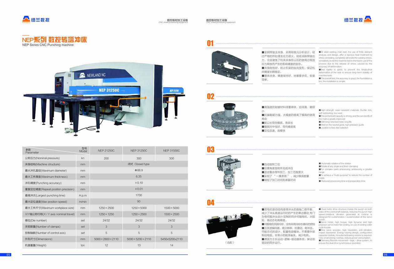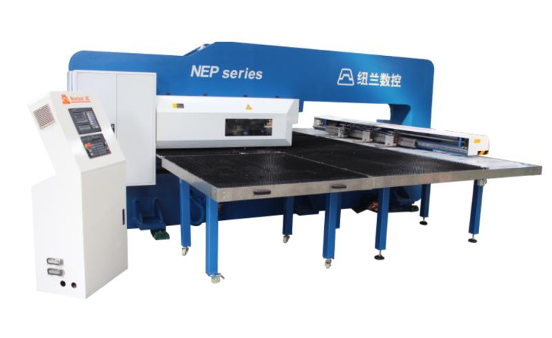 NEP系列全電伺服轉(zhuǎn)塔沖產(chǎn)品介紹 數(shù)控轉(zhuǎn)塔沖床是板材加工設(shè)備中最具生命力的產(chǎn)品,用于各類金屬薄板零件加工,可以一次性自動(dòng)完成多種復(fù)雜孔型和淺拉深成型加工。通過自動(dòng)編程,可對(duì)板材進(jìn)行X,Y方向的精確定位,自動(dòng)選擇轉(zhuǎn)盤模具庫(kù)中的模具,按程序加工不同尺寸和孔距的孔,也可用小沖模以步?jīng)_方式加工尺寸較大的各種形狀的曲線輪廓,也可進(jìn)行特殊工藝加工,如百葉窗,淺拉伸,沉孔,翻邊孔,加強(qiáng)筋,壓印等。